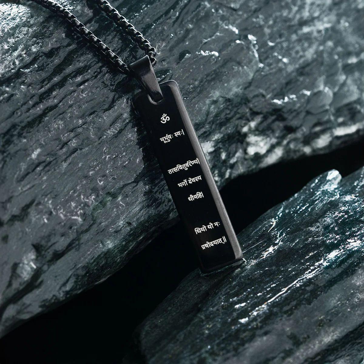 The Gayatri Mantra Chain Pendant is a powerful symbol of divinity, protection, and inner calm. With a beautifully engraved Sanskrit mantra on a premium matte-black plate, this pendant blends spiritual meaning with modern, bold style — perfect for daily wear.